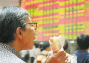 昨日,滬市綜指逼近5200點大關。在廈門某證券營業(yè)廳,一名邊看行情邊吃面包的老婆婆不禁露出笑容。(藍添藝 攝)