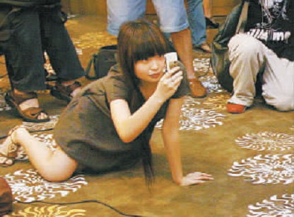 26日,吳奇隆現身廈門,為電視劇《聊齋奇女子》做宣傳,為一睹偶像風采,不少粉絲跪地搶拍。(陳理杰 攝)