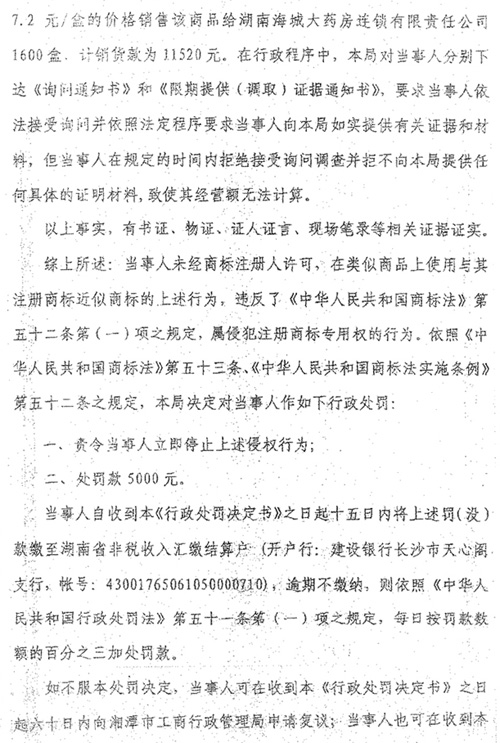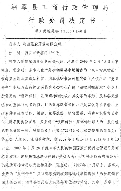 湘潭縣工商局對強(qiáng)森藥業(yè)的處罰決定書
