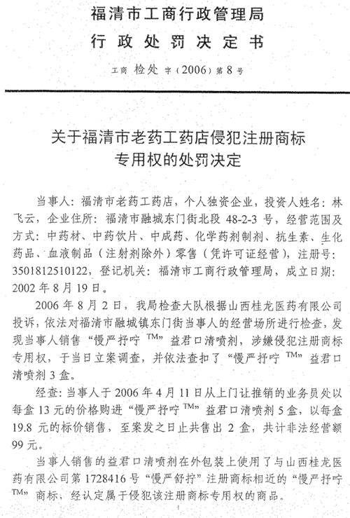 福清工商局處罰藥店侵犯商標專用權(quán)