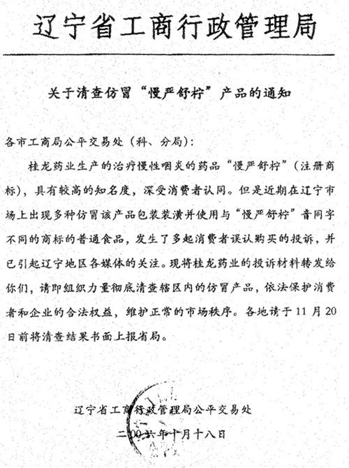 遼寧工商局清查仿冒"慢嚴(yán)舒檸"的通知