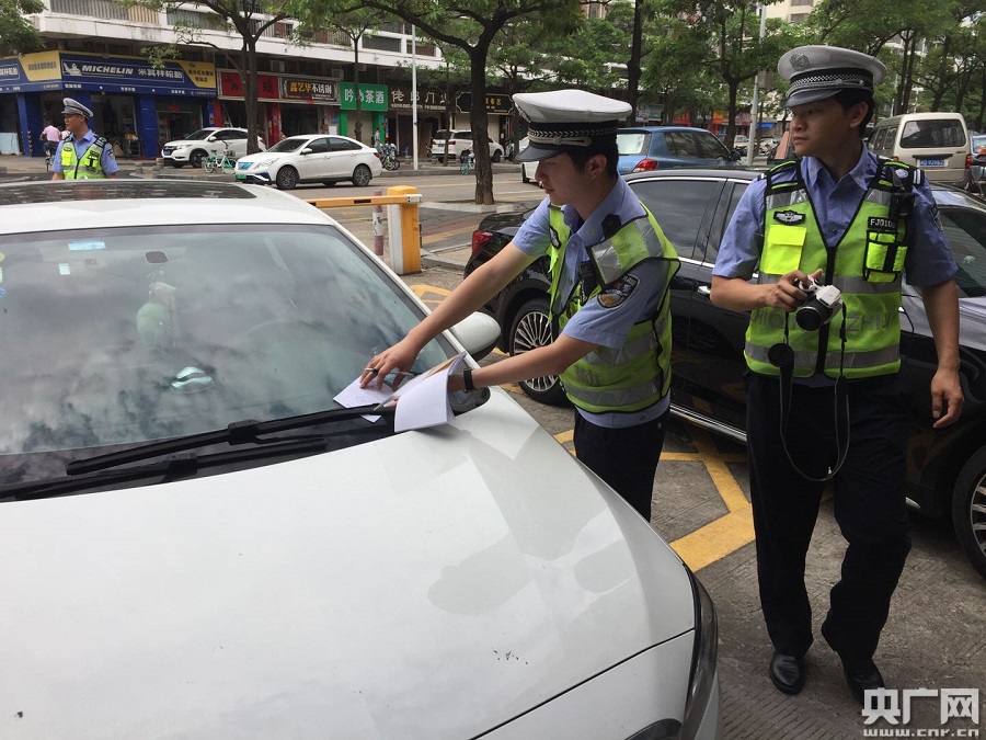 交警查處停放在消防車道上的私家車(央廣網(wǎng)發(fā) 通訊員供圖)