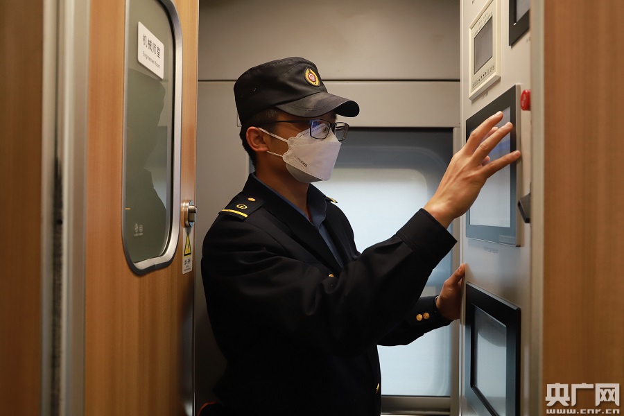 馮良良每隔2小時(shí)就會(huì)對(duì)車廂內(nèi)旅客服務(wù)設(shè)施狀態(tài)進(jìn)行一次全面巡查(央廣網(wǎng)發(fā) 戴志強(qiáng) 攝)
