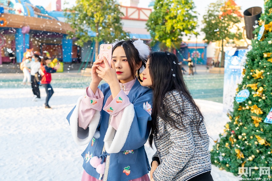 走進(jìn)鋪滿白色砂石的路面,咔吱咔吱仿佛踩在雪地里,北極熊、雪人等造型隨處可見,漫天飛舞的泡沫輕輕落在身上,讓人想起“你在南方的艷陽(yáng)里大雪紛飛”的歌詞。26號(hào)下午,廈門方特夢(mèng)幻王國(guó)景區(qū)里,眾多游客被廈門方特變裝冰雪節(jié)的精彩演出和逼真雪景吸引,紛紛駐足欣賞、拍照打卡。