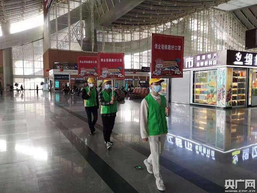 青年志愿者在提醒候車旅客佩戴好口罩(央廣網(wǎng)發(fā) 通訊員供圖)