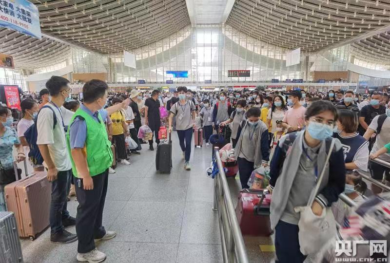車站工作人員引導學生進站上車(央廣網(wǎng)發(fā) 通訊員供圖)