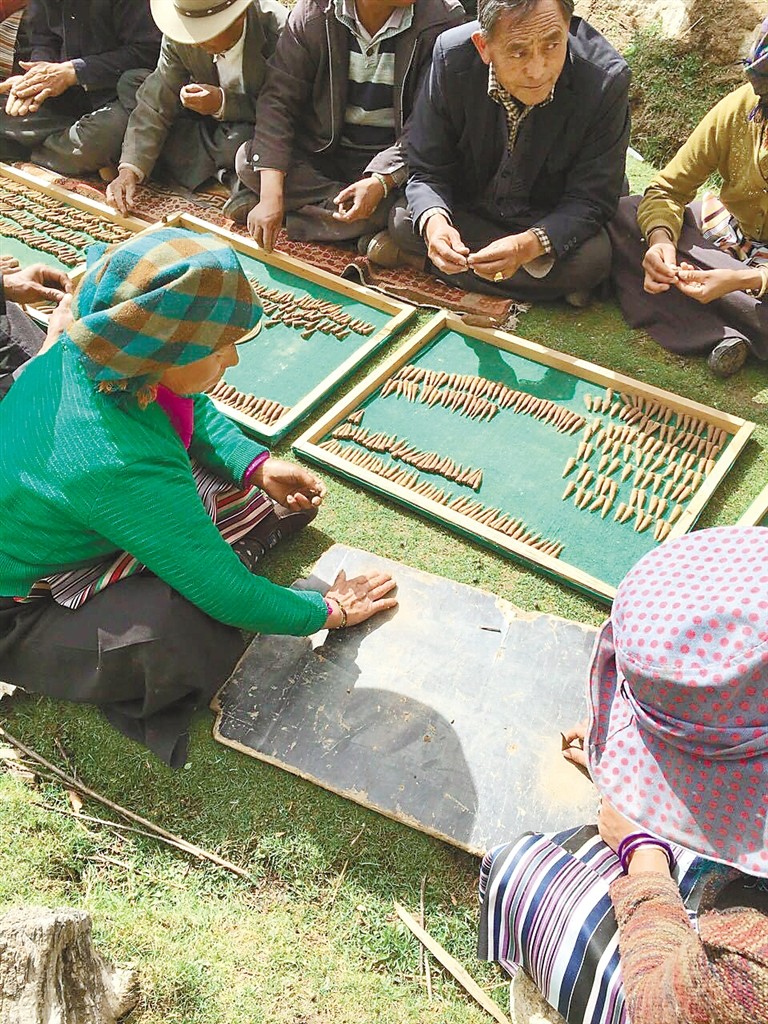 拉薩市尼木縣吞巴鄉(xiāng)吞達(dá)村村民正在手工制作藏香(記者 王雨霏 攝)