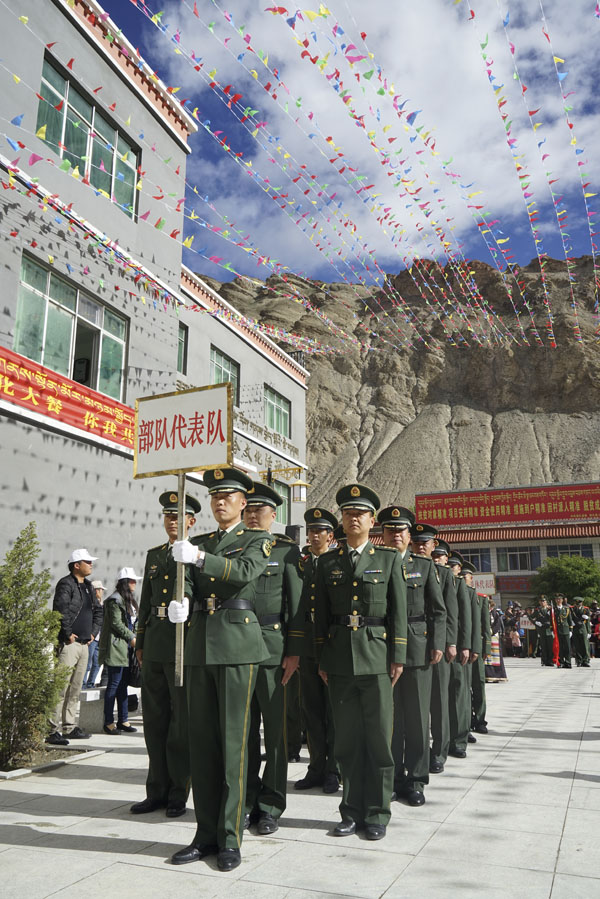 開幕式共分為五項(xiàng)議程。首先,來自洛扎縣各單位的8個(gè)游行方隊(duì),共200多人,在觀眾們的歡呼喝彩聲中依次入場(chǎng),順時(shí)針繞廣場(chǎng)一周,為開幕式預(yù)熱。其中,當(dāng)?shù)伛v軍部隊(duì)的官兵步伐整齊、英姿颯爽、口號(hào)洪亮,當(dāng)?shù)匕傩諢o一不歡呼鼓掌,也為這些平日里擔(dān)任祖國(guó)邊防重任的人民子弟兵送去節(jié)日的祝福。另外,僧尼方隊(duì)、藏戲表演隊(duì)、退休人員方隊(duì)、學(xué)生儀仗隊(duì)等方隊(duì)也都展示了各具特色的風(fēng)采,現(xiàn)場(chǎng)氣氛一下子被點(diǎn)燃。