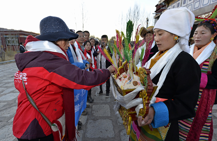 11月12日,在位于拉薩市林周縣的一個家庭旅館外,藏族群眾端著切瑪盒(五谷豐收斗),迎接前來體驗藏家風(fēng)情的游客。 近日,由拉薩市旅游局等主辦的“冬游藏家·拉薩人家體驗游”活動在拉薩老城區(qū)及周邊縣鄉(xiāng)開展,為游客提供了一次體驗雪域高原冬季獨特魅力的機會。 新華社記者 劉東君 攝