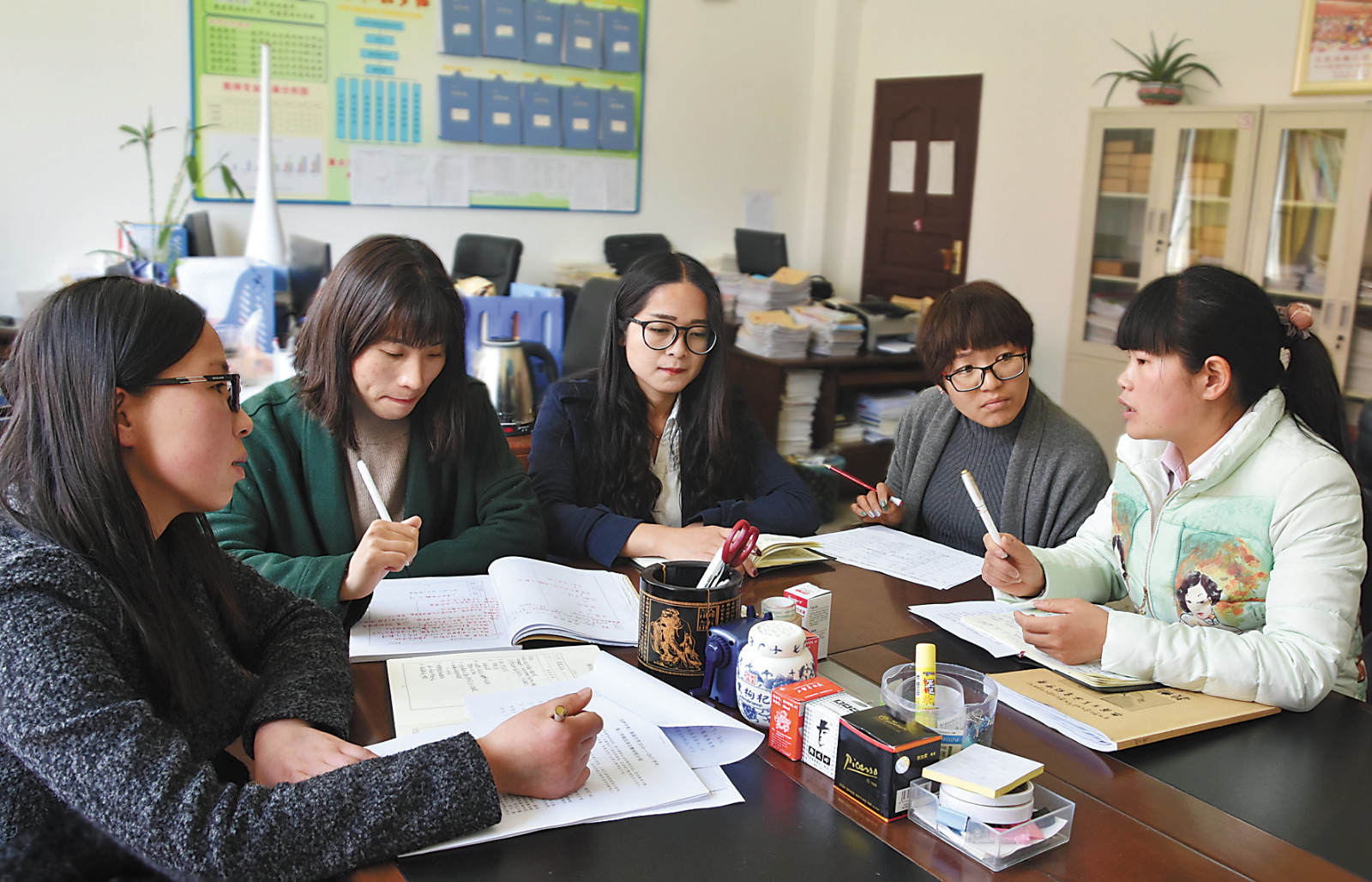 胥玉蓉和同事們一起研究和探討如何提高即將參加高考學生們的語文成績。格桑倫珠 鹿麗娟 攝 -