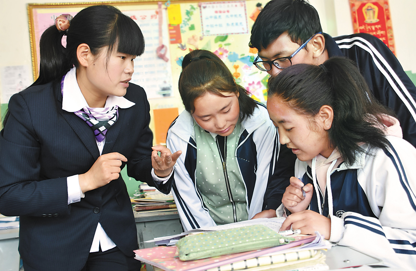 胥玉蓉老師利用課間休息時間,為高三(10)班的學生輔導漢語文作文。格桑倫珠 鹿麗娟 攝 -