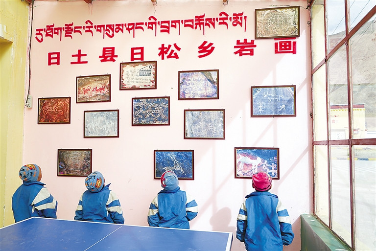 阿里地區(qū)日土縣日松鄉(xiāng)境內(nèi)有任姆棟、嘉偉、塔康巴、爾阿、讀龍那卡、加木嘎、那戈石哦、曲龍等巖畫點(diǎn)10處,其中任姆棟巖畫最著名,其代表作為《最美麗的鹿》和《血祭圖》。近年,為讓下一代更好地了解和體驗(yàn)當(dāng)?shù)貍鹘y(tǒng)文化,日松鄉(xiāng)小學(xué)在校園內(nèi)建立了巖畫圖片展示室,并將一些精美巖畫繪制在校舍墻壁上。