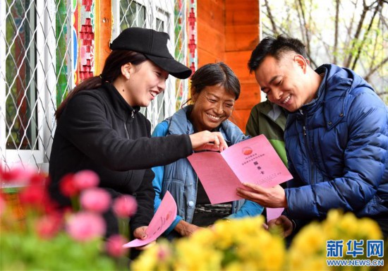 •   5月5日,廣東省第八批援藏工作隊波密工作組成員(左)為貧困戶投保人(中)講解“脫貧保”家庭成員意外傷害保險內容。新華社記者 晉美多吉 攝