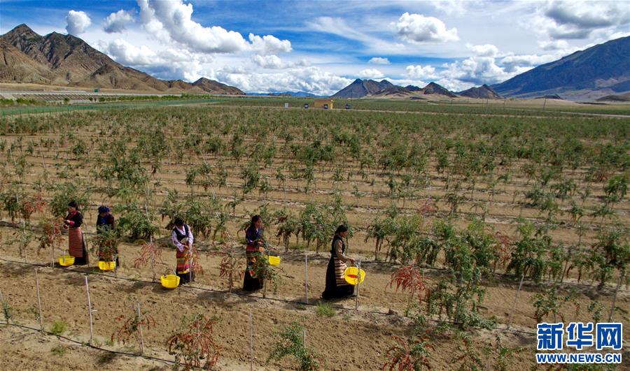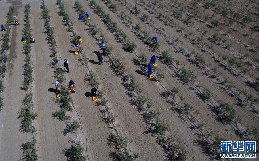 產(chǎn)業(yè)園員工邊巴普尺(左前)在采摘枸杞(9月5日攝)。新華社記者 張汝鋒 攝 -