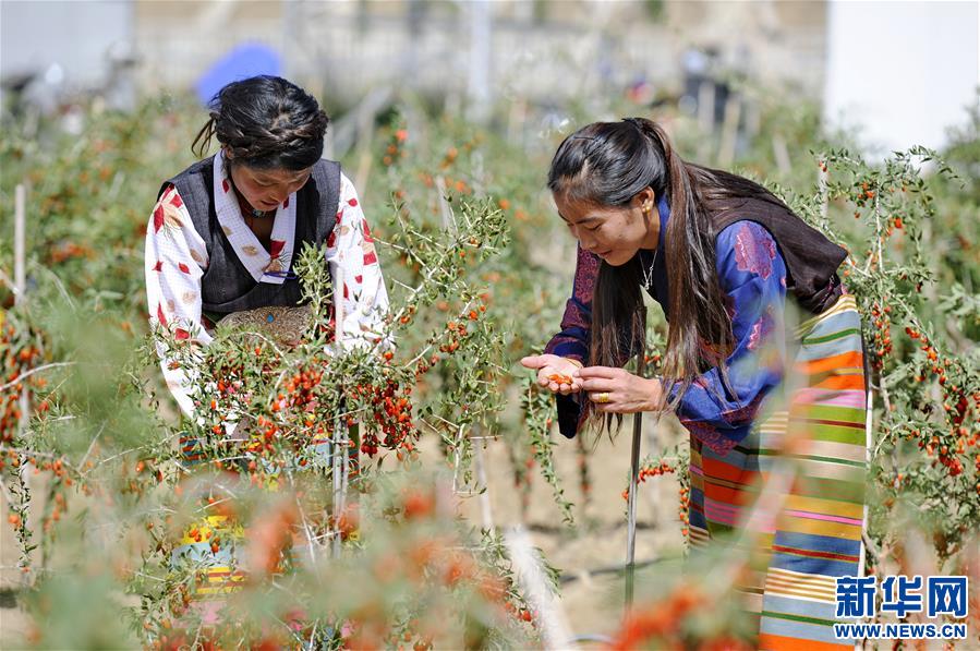 產(chǎn)業(yè)園員工那珍(左)和多吉卓瑪在采摘枸杞(9月5日攝)。新華社記者 張汝鋒 攝