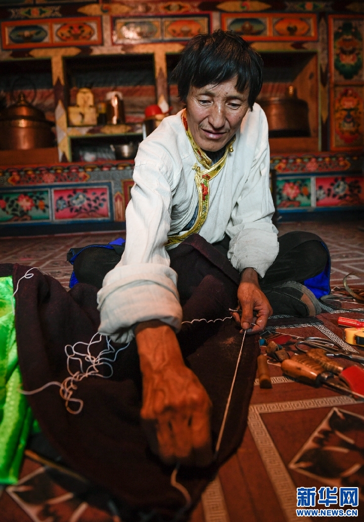 。叮硽q的白瑪金巴是波密縣多吉鄉(xiāng)德吉村人,從17歲起便開始學(xué)習(xí)藏裝制作,手藝精湛,遠近聞名,去年被確定為波密縣非物質(zhì)文化遺產(chǎn)傳承人。
