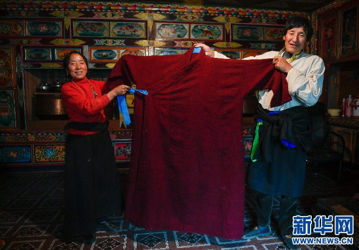 白瑪金巴(右)與妻子在家中展示做好的藏裝(10月24日攝)。新華社記者 劉東君攝