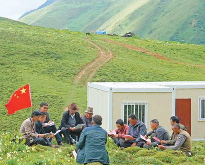 “如今,我們邊境牧民告別了土氈棚,全部住上了裝配式新牧房,還可以開(kāi)車放牧、用太陽(yáng)能發(fā)電打酥油!痹饔貌卣Z(yǔ)讀完黨的十九大報(bào)告中關(guān)于鄉(xiāng)村振興戰(zhàn)略的表述,結(jié)合新聞和邊境牧民生產(chǎn)生活條件的變化,娓娓道來(lái)。整個(gè)夏天都在這里放牧的黨員和牧民群眾圍坐在草場(chǎng)上,認(rèn)真聆聽(tīng)講解,不時(shí)插話、提問(wèn)。
