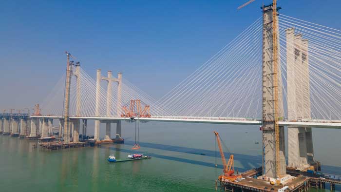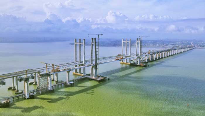 新建福州至廈門高速鐵路(簡稱“福廈高鐵”)是國內(nèi)首條跨海高鐵,項(xiàng)目位于福建省沿海地區(qū),北起福州市,南至廈門市和漳州市,正線全長277.42公里,設(shè)計時速350公里。中交二航局承建的第6標(biāo)段為全線施工難度最大的標(biāo)段,路線起于泉州市臺商投資區(qū),跨越泉州灣進(jìn)入晉江市,全長27.455公里。其中全線重點(diǎn)控制性工程——泉州灣跨海大橋全長20.287公里,海上橋梁長8.96公里,跨越泉州灣的主橋長800米、主跨400米,為雙塔雙索面鋼混結(jié)合梁半漂浮體系斜拉橋,這也是國內(nèi)首座跨海高速鐵路橋。