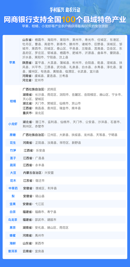 為了進(jìn)一步支持這些特色產(chǎn)業(yè),本月起,多地政府與網(wǎng)商銀行合作,推出“助農(nóng)計(jì)劃”,首批為全國100個(gè)縣域的特色產(chǎn)業(yè)提供2個(gè)月免息貸款,由當(dāng)?shù)卣冗x拔的1000位產(chǎn)業(yè)帶頭人,可以獲得全年免息貸款。