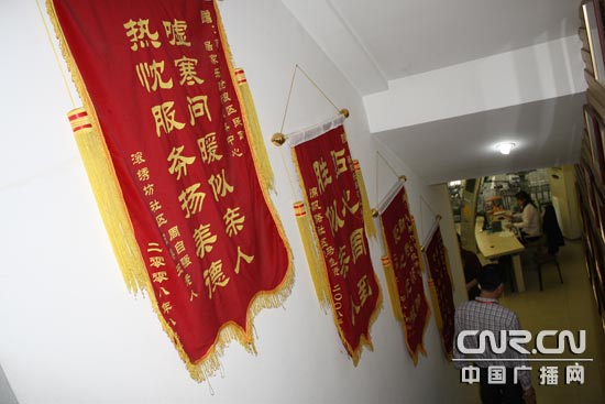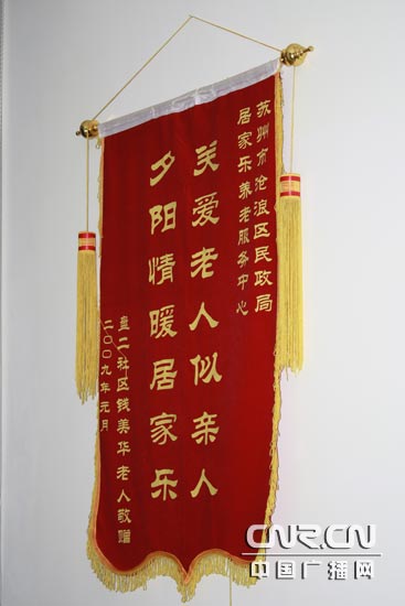 滿含感激的錦旗掛滿“鄰里情虛擬養(yǎng)老院”。(中廣網(wǎng)記者李玲燕 攝)