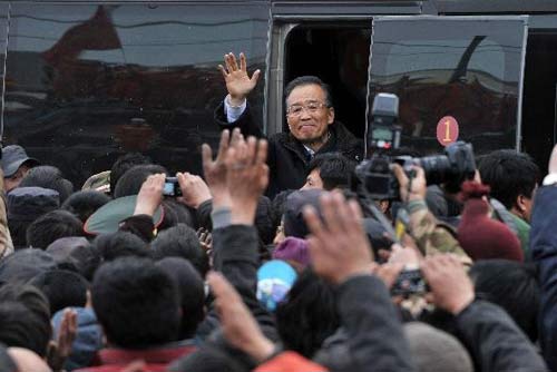 溫家寶在青海省玉樹縣結(jié)古鎮(zhèn)看望慰問災(zāi)區(qū)群眾。