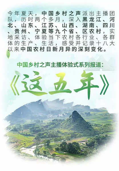 中國(guó)鄉(xiāng)村之聲這五年,見(jiàn)證了十八大以來(lái)中國(guó)農(nóng)村日新月異的這五年。為了感受并記錄中國(guó)農(nóng)村這五年的深刻變化,今年夏天,中國(guó)鄉(xiāng)村之聲派出主持人團(tuán)隊(duì),歷時(shí)兩個(gè)多月,深入河北、山東、寧夏、四川、黑龍江等九個(gè)省、區(qū)的農(nóng)村,實(shí)地采訪(fǎng)、體驗(yàn)當(dāng)下農(nóng)村各行業(yè)、各群體的生產(chǎn)、生活。