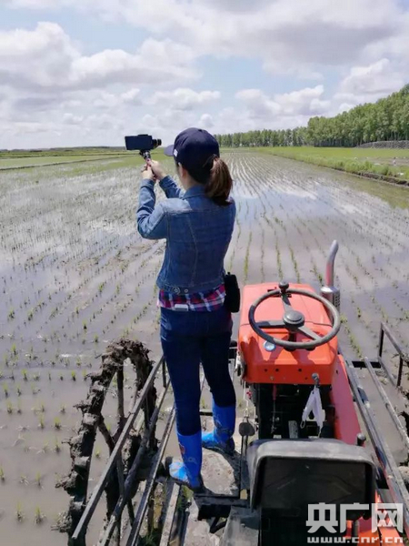 主播尹媛:這個(gè)揚(yáng)肥機(jī)看上去開(kāi)著不難,其實(shí)還是很需要技術(shù)的,因?yàn)橐坏┢司涂赡軌旱降久,所以(xún)蓚(gè)輪子要在稻苗中間行走。