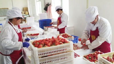 玖玖家庭農(nóng)場的工人在包裝外銷草莓。本報記者買天攝
