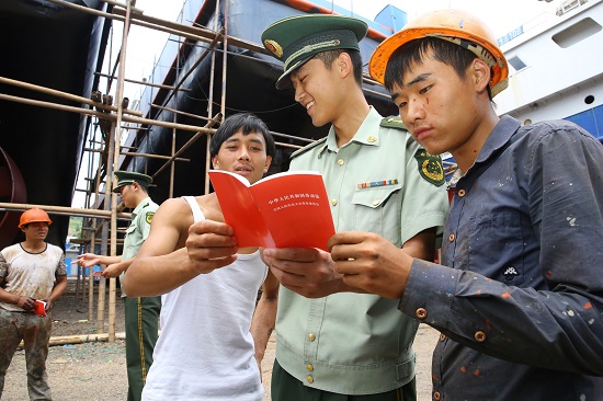 圖為,8月25日,桐照邊防官兵為轄區(qū)工地建筑工宣傳法律知識。(吳慧華)