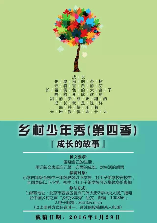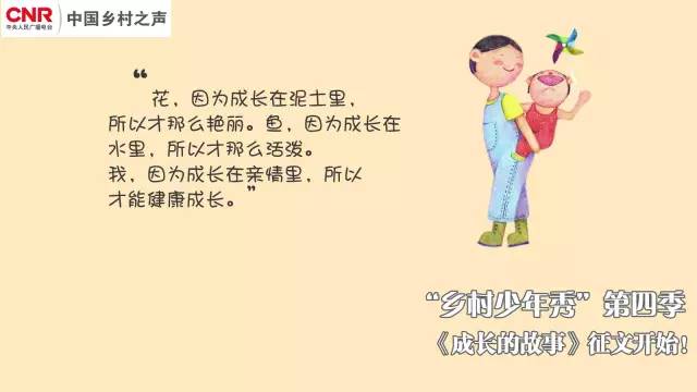 2、優(yōu)秀作品將邀請(qǐng)作者自己朗讀,制作成錄音成品,在中央人民廣播電臺(tái)中國(guó)鄉(xiāng)村之聲《鄉(xiāng)村少年》節(jié)目中播出,同時(shí)在中國(guó)鄉(xiāng)村之聲官方微博、微信,以及央廣網(wǎng)網(wǎng)頁(yè)中呈現(xiàn)。