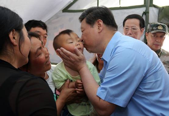 2013年5月21日,四川蘆山地震災(zāi)區(qū),習(xí)近平總書記在蘆山縣體育館安置點一帳篷內(nèi)親撫一個小孩。新華社記者蘭紅光攝