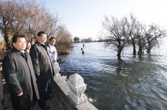 2015年1月20日,習(xí)近平來到大理白族自治州大理市灣橋鎮(zhèn)古生村,仔細察看洱海邊的生態(tài)保護濕地。新華社記者鞠鵬攝