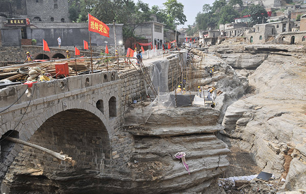 8月2日,在河北井陘縣南峪鎮(zhèn)臺頭村,交通部門正在搶修一座橋梁,橋下是這次洪災(zāi)沖出的古河床。