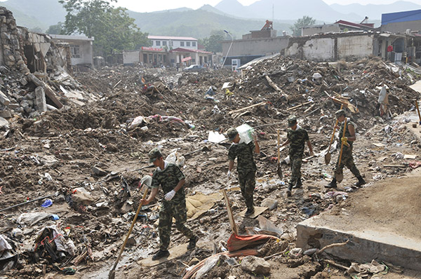 8月2日,在河北井陘縣南峪鎮(zhèn)臺頭村,武警河北總隊的官兵行走在村中一條受損嚴(yán)重的街道上。武警河北總隊派出500名官兵在臺頭村幫助村民清理淤泥,重建家園。