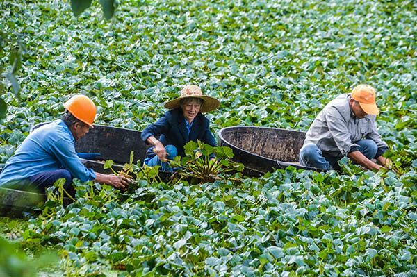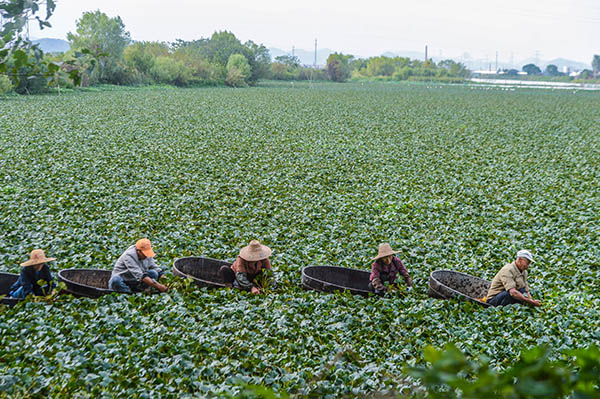 10月9日,東林鎮(zhèn)的農(nóng)民們劃著木桶,采摘?jiǎng)偝墒斓牧饨恰?/p>