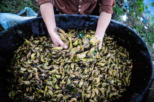 10月9日,東林鎮(zhèn)的農(nóng)民在整理剛采摘上來(lái)的菱角。