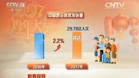 中國雞年春節(jié)七天假期,帶動的是40天的大遷徙。國家發(fā)改委、交通運輸部等部門預(yù)測,2017年中國春運旅客發(fā)送量將達29.78億人次,同比增長2.2%。其中,道路25.2億人次,增長1%;鐵路3.56億人次,增長9.7%;民航5830萬人次,增長10%;水運4350萬人次,增長2%,近十年春運交通數(shù)據(jù)幾乎年年創(chuàng)新高,說明春運規(guī)模在逐年擴大。