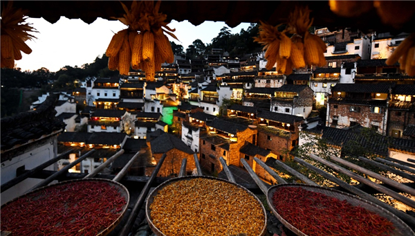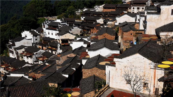 10月26日,篁嶺村村民在晾曬皇菊。10月26日拍攝的篁嶺古村一角。近日天氣晴朗,江西省婺源縣江灣鎮(zhèn)篁嶺村村民抓住時(shí)機(jī)采摘、晾曬皇菊及蔬果。明黃的菊花、火紅的辣椒……各種顏色將篁嶺古村裝扮成巨大的“調(diào)色板”,引來眾多游客感受鄉(xiāng)村美景。