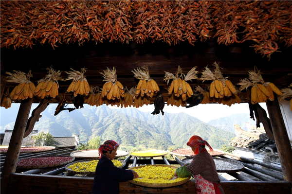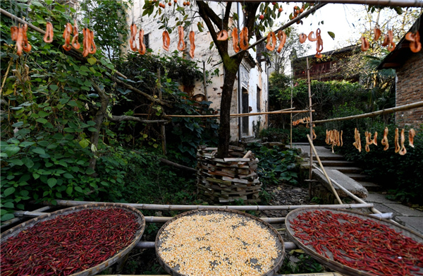 10月26日拍攝的篁嶺古村。家家戶戶晾曬各種蔬果及皇菊。