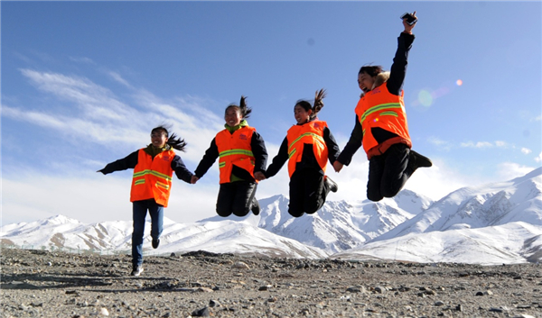 10月23日,在青藏鐵路格拉段玉珠峰站,信號女子工班的4名女職工在海拔4100多米的昆侖雪山下一起跳躍。