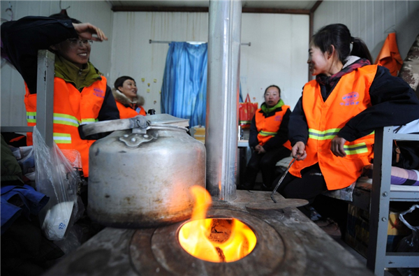 10月23日,在海拔4100多米的青藏鐵路格拉段玉珠峰站工地簡易板房宿舍,信號女子工班的4名女職工在爐火旁休息。