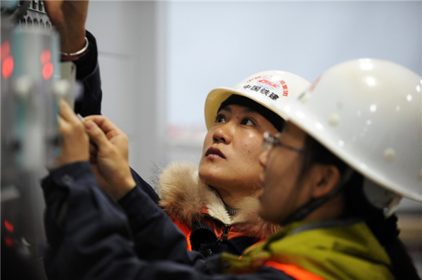 10月23日,信號工王珊(左)與張菲菲在青藏鐵路格拉段昆侖橋站信號室內(nèi)進(jìn)行接線作業(yè)。