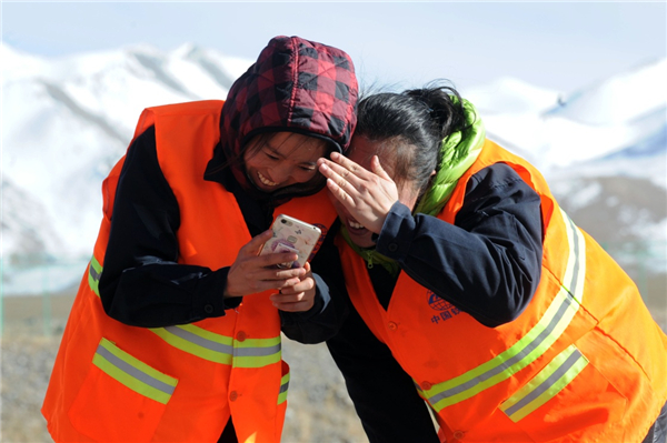 10月23日,信號工李芳(左一)與“大姐”鄭艷工作間隙在昆侖雪山下看手機里的照片。