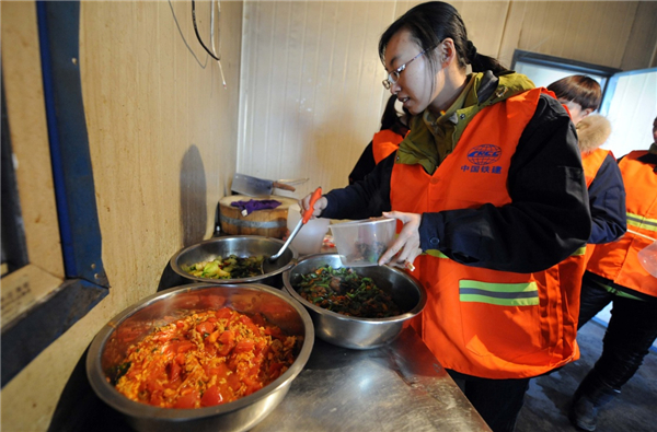 10月23日,信號工張菲菲在青藏鐵路格拉段玉珠峰站工地食堂打飯。