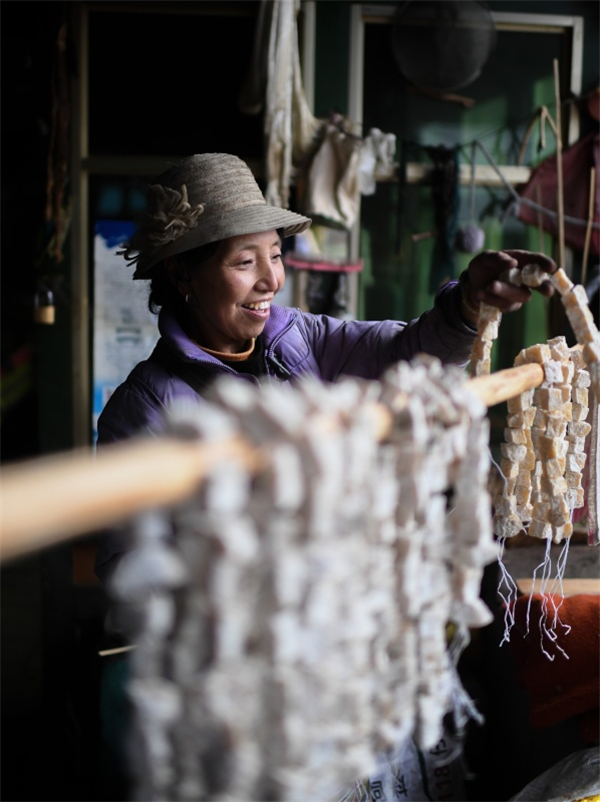 10月29日,卓嘎在家中曬奶渣。