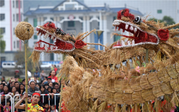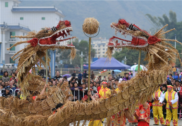 廣西羅城仫佬族自治縣舉行舞草龍大賽,來自各鄉(xiāng)鎮(zhèn)的草龍代表隊會聚縣城,歡慶一年五谷豐登,祈福來年風調雨順。
