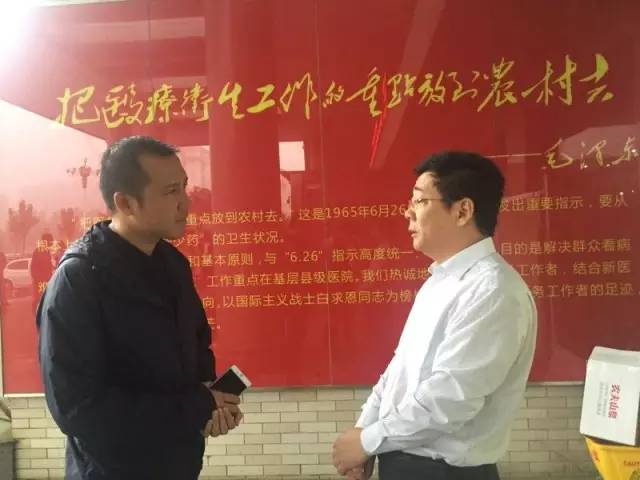 中國鄉(xiāng)村之聲記者田龍采訪臨潁縣人民醫(yī)院副院長呂永軍。就像背后的標語一樣,“愛在鄉(xiāng)村”公益活動就是要“把醫(yī)療衛(wèi)生的重點放到農(nóng)村去”。