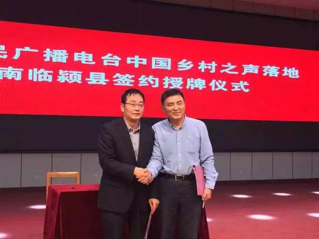 中央人民廣播電臺與臨潁縣舉行簽約儀式,并授予臨潁縣“中央人民廣播電臺廣播惠農(nóng)工程示范縣”和“中國鄉(xiāng)村之聲愛在鄉(xiāng)村公益活動示范縣”,這標志著,在臨潁就可以收聽到中國鄉(xiāng)村之聲的精彩節(jié)目。