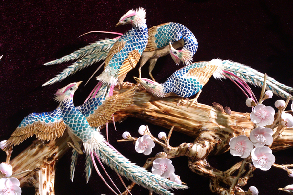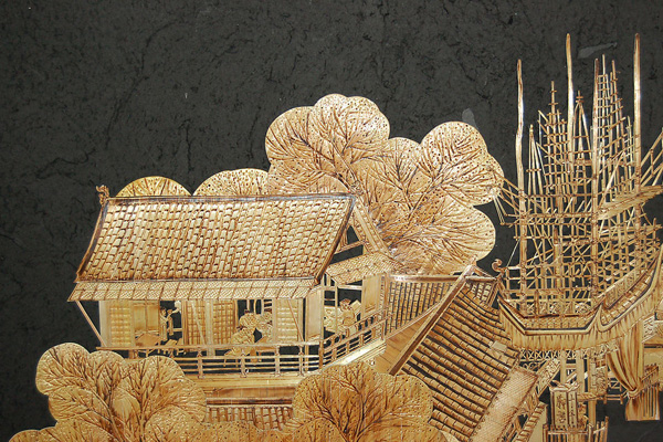王銘偉:有,我們?nèi)谌肓艘恍┳钚碌募庸すに嚲褪橇Ⅲw浮雕,整幅畫給人的感覺更立體更逼真。它既符合現(xiàn)代的審美觀,同時也不失國畫的大氣,還有莊重的感覺。